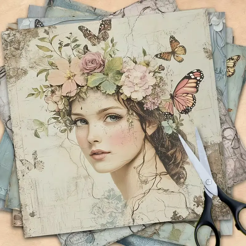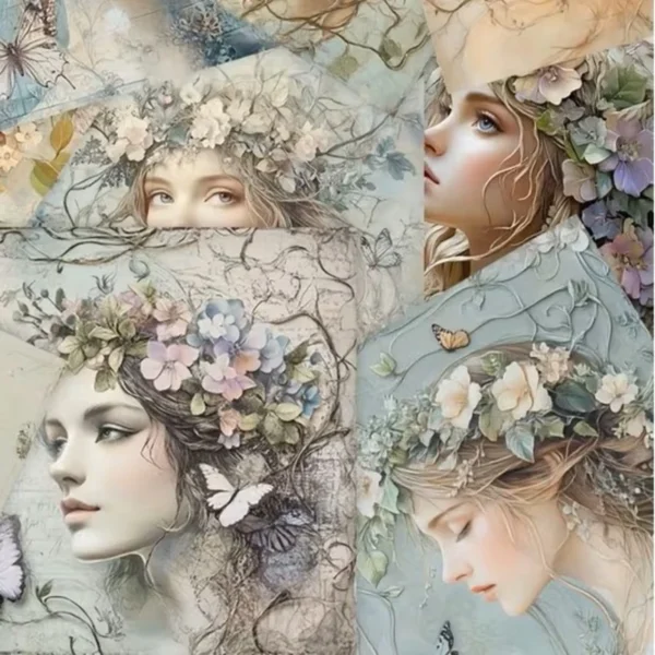 Laat je creativiteit bloeien met deze prachtige set decoratieve papieren, geïnspireerd op dromerige bloemenmeisjes en zachte pasteltinten. Elk vel toont een unieke illustratie van een meisje met een bloemenkrans, vlinders of romantische details die perfect passen bij een lente-, vintage- of botanisch thema.