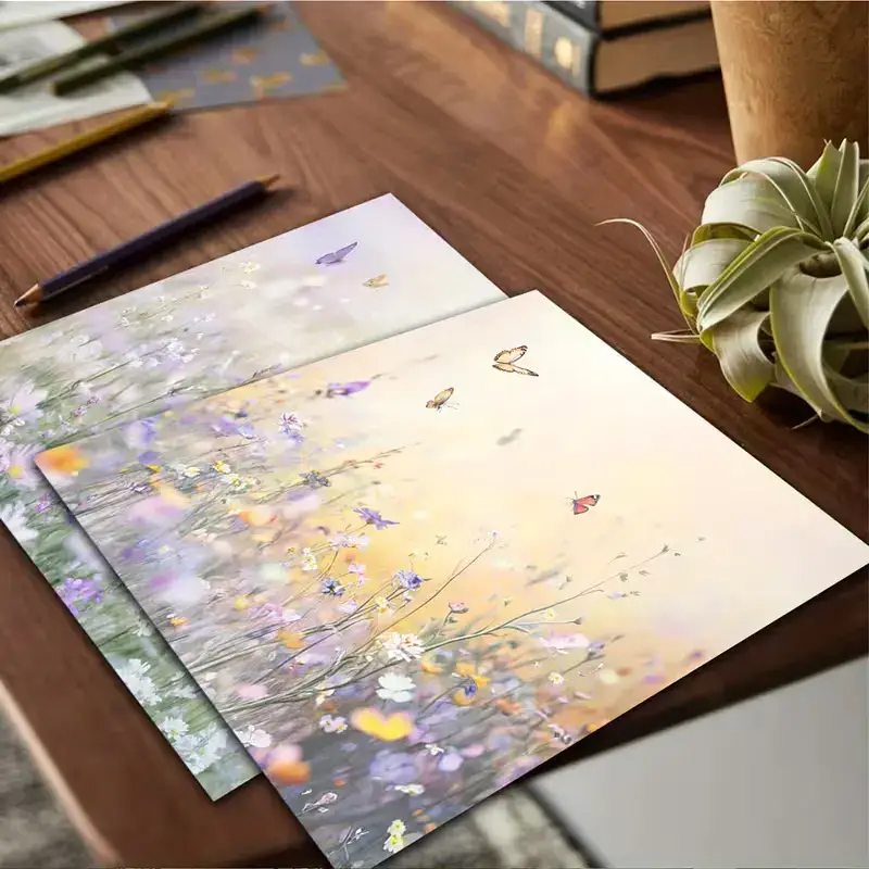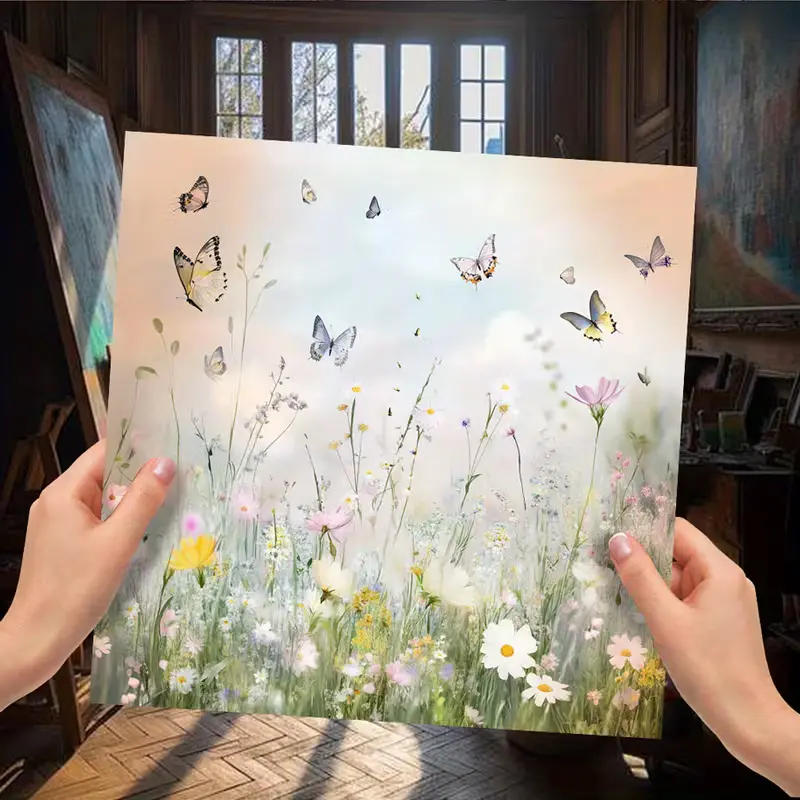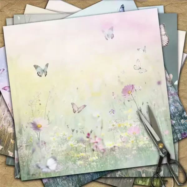 Laat je creativiteit bloeien met deze prachtige set van 10 decoratieve papieren in bloemenwonderland-thema. Elk papier is 15×15 cm groot en bedrukt met betoverende illustraties van bloemenweides, fladderende vlinders en zachte pastelachtergronden. De ontwerpen stralen rust en romantiek uit, ideaal voor het maken van lentegroeten, art journals, collages of romantische scrapbookingprojecten.