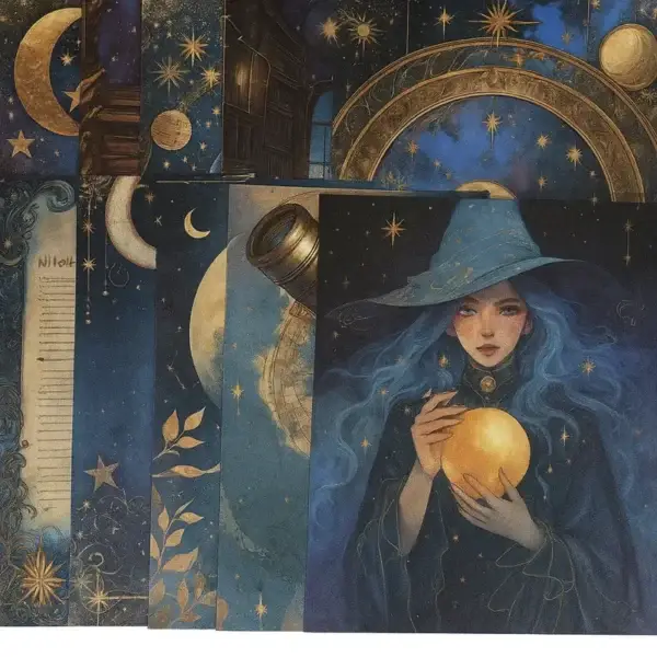 Laat je betoveren door het mysterieuze thema van deze “magische nachten” papierset. Elke afbeelding vertelt een verhaal van sterren, maanlicht, astrologie en dromerige illustraties, waaronder een magische heks met een fonkelende maan in haar hand. De kleuren zijn rijk en diep: nachtblauw, goudaccenten en zachte pasteltinten zorgen voor een dromerige sfeer in je creaties.