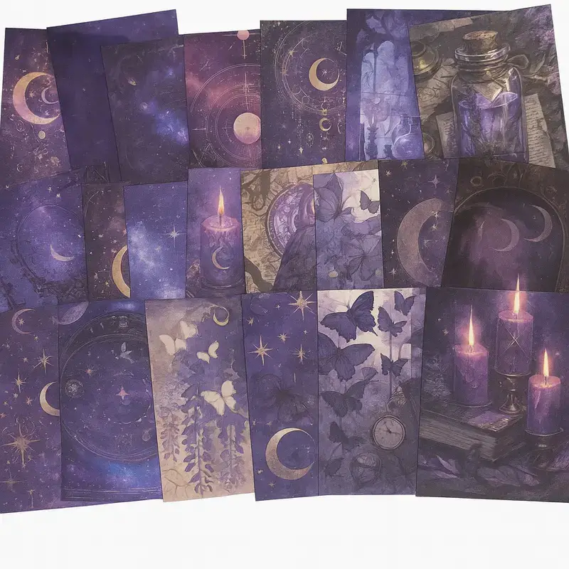 Deze set bevat 20 verschillende mini papieren met prachtige, mystieke illustraties. Elk papiertje meet 3,5 x 5,5 cm en is ideaal voor journaling, scrapbooking of het versieren van cadeautjes, kaarten of je planner. De ontwerpen zijn geรฏnspireerd op maanstanden, sterrenhemels, kastelen, bossen en magie.