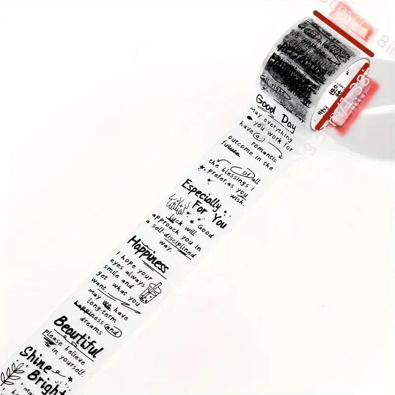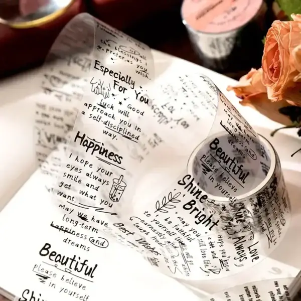 Deze Pet Tape Engelse woorden op rol is een absolute must-have voor liefhebbers van journaling, scrapbooking en kaartontwerpen. De tape is gemaakt van transparant PET-materiaal en bedrukt met sfeervolle Engelse quotes en woorden in een charmante handgeschreven stijl. Denk aan woorden als Shine Bright, Happiness en Especially For You โ ideaal om je pagina’s mee op te vrolijken of net dat beetje extra te geven.
