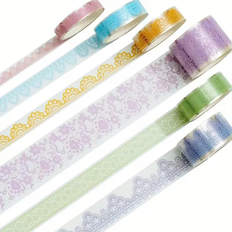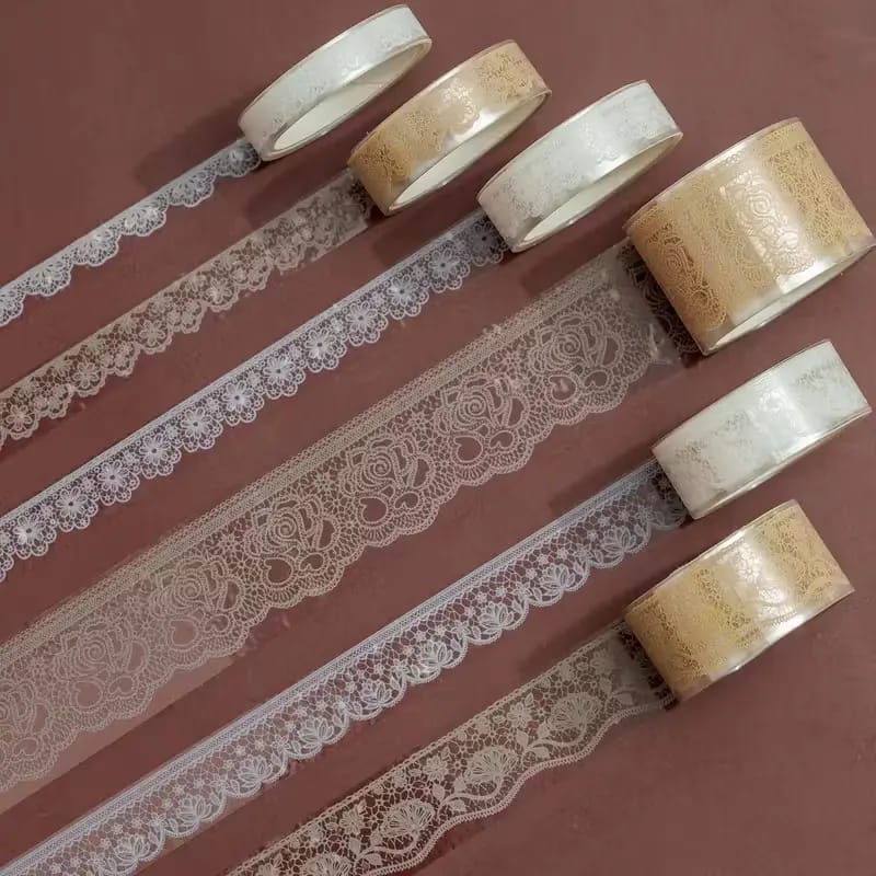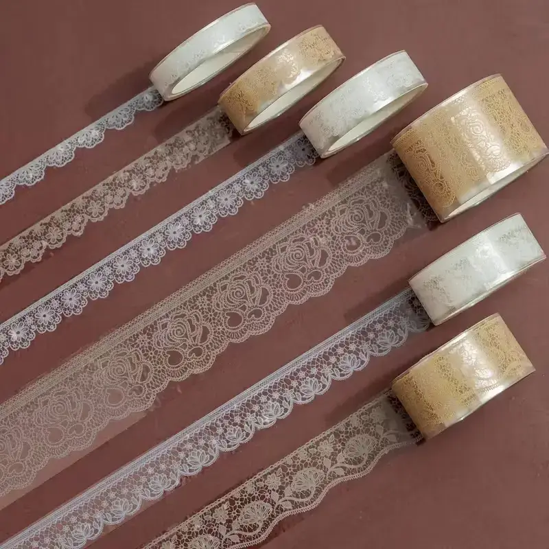 Deze stijlvolle PET tape rolletjes met kantmotief geven jouw creatieve projecten een luxe en verfijnde uitstraling. De tapes zijn gemaakt van duurzaam PET-materiaal en bedrukt met gedetailleerde kantpatronen die doen denken aan echt kant.