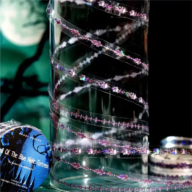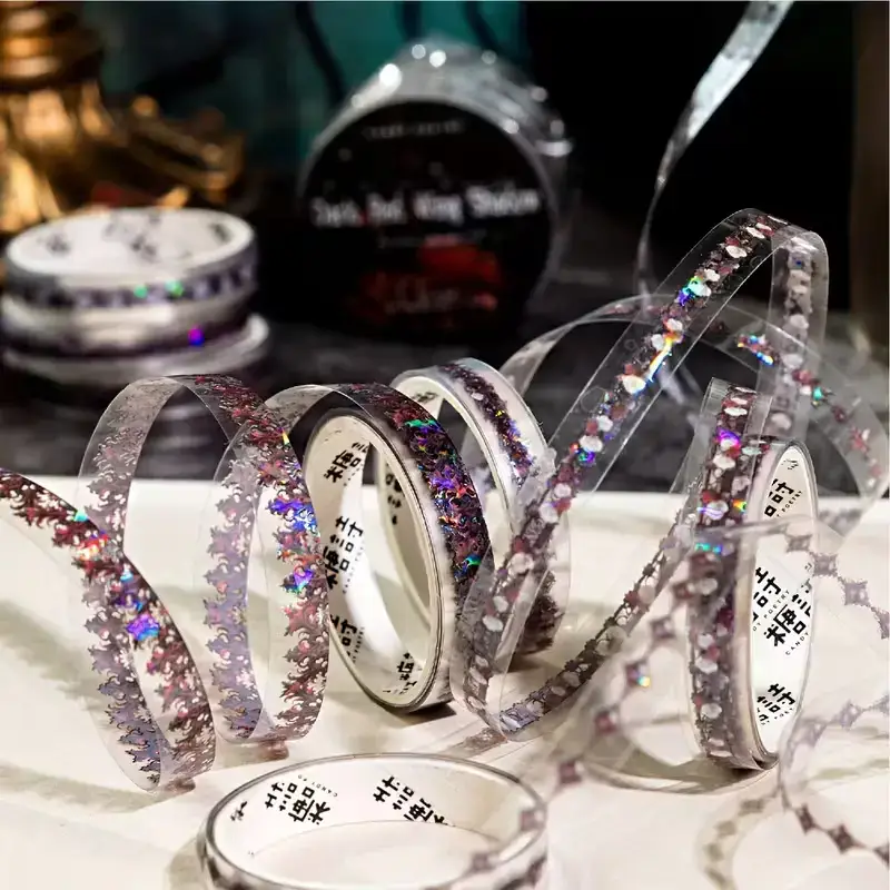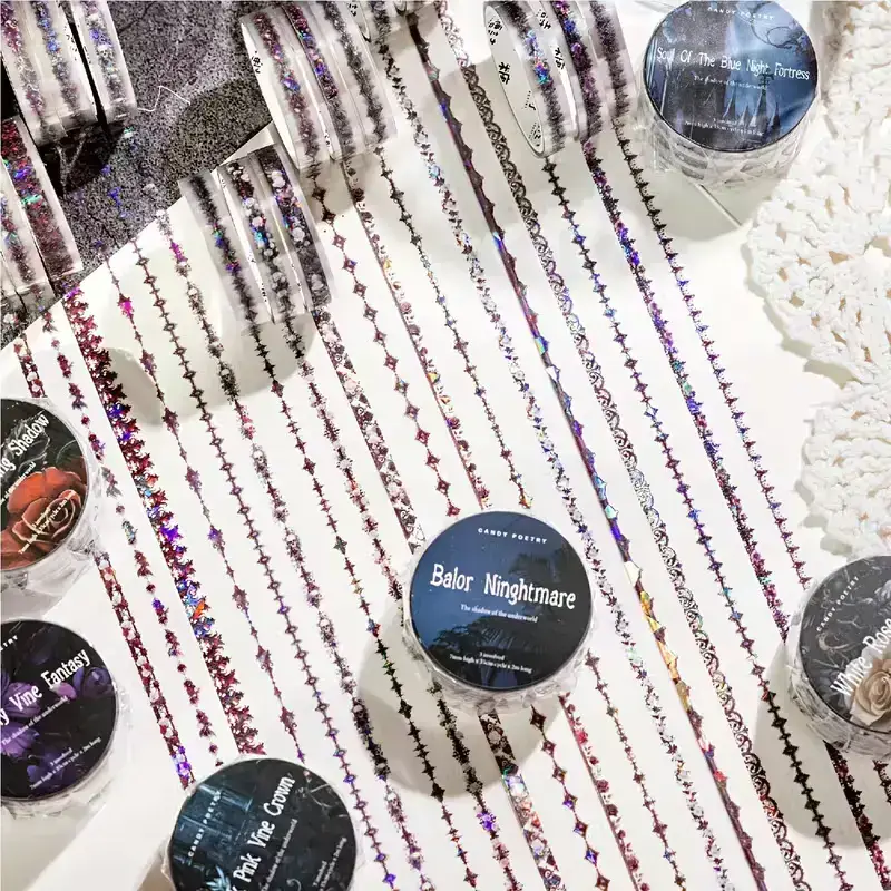 Geef je scrapbook, bullet journal of creatieve knutselprojecten een elegante uitstraling met deze PET tape rollen met sierranden. Elke variant bestaat uit 3 kleine smalle rollenย met unieke patronen in donkere, mysterieuze en romantische stijlen.