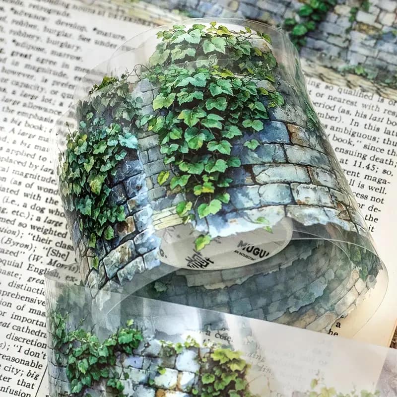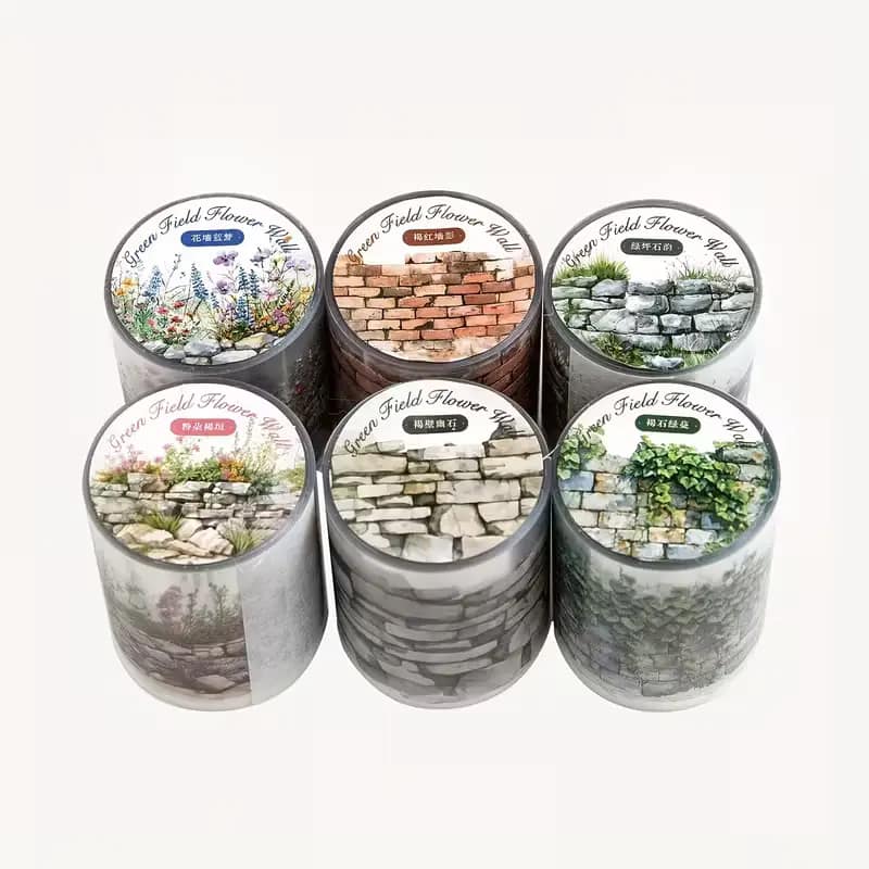 De collectie bestaat uit 6 varianten, elk met hun eigen stijl: van strakke grijze muren en klassieke bakstenen tot romantische bloemenmuren en groene klimop. Dankzij het duurzame en semi-transparante PET-materiaal kun je de tape makkelijk knippen, scheuren of combineren met andere decoratieve tapes.