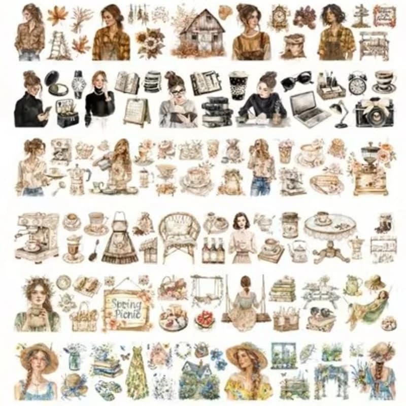 Breng een vleugje elegantie en nostalgie in je creatieve projecten met deze hoogwaardige PET tape. Elk rolletje toont sfeervolle illustraties van vrouwen in vintage outfits, gecombineerd met tafereeltjes uit het dagelijks leven: bloemenwinkels, boeken, tuinieren, koffie, typmachines en meer.