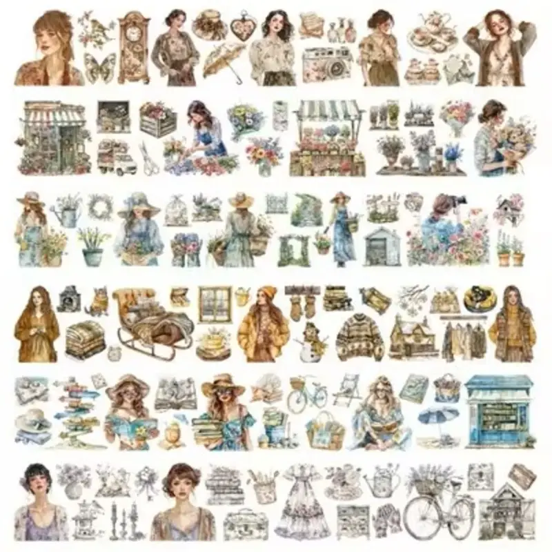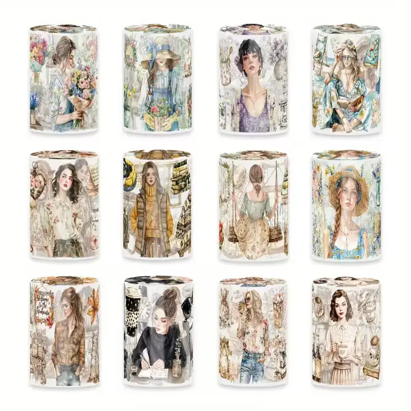 Breng een vleugje elegantie en nostalgie in je creatieve projecten met deze hoogwaardige PET tape. Elk rolletje toont sfeervolle illustraties van vrouwen in vintage outfits, gecombineerd met tafereeltjes uit het dagelijks leven: bloemenwinkels, boeken, tuinieren, koffie, typmachines en meer.