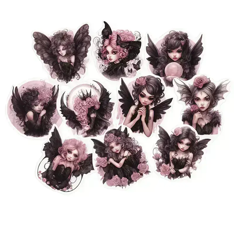 Breng een vleugje duistere elegantie en fantasie in je creaties met deze stickerset vol Gothic Meisjes in roze en zwart. Elke sticker toont een betoverende illustratie van een meisje in gothic stijl โ compleet met vleugels, rozen, strikken, en mysterieuze blikken. De kleurencombinatie van diepzwart met zachtroze zorgt voor een unieke mix van stoer รฉn romantisch.