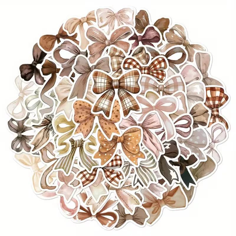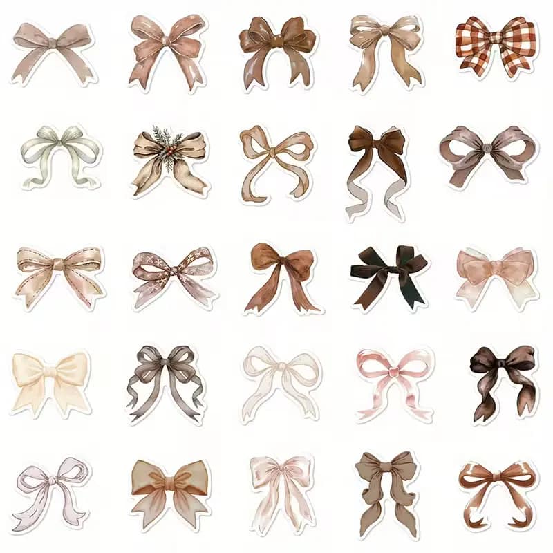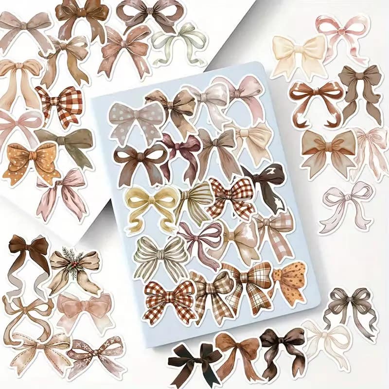 Elke set bevat 10 zorgvuldig ontworpen stickers met verschillende strikken in natuurlijke tinten zoals beige, bruin, crème en zachtroze. De stickers hebben een realistische en stijlvolle uitstraling, waardoor ze perfect zijn voor allerlei creatieve toepassingen.