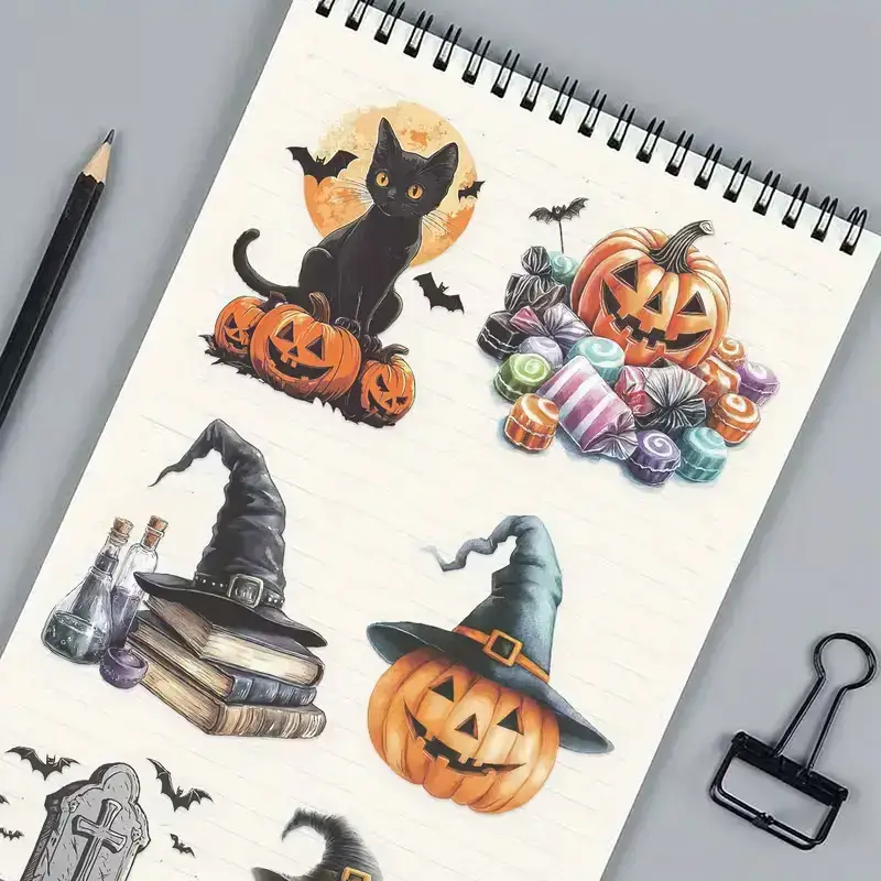 Laat je creativiteit de vrije loop met deze betoverende set van 10 transparante stickers in Halloween-thema. Denk aan pompoenen, heksenhoeden, spoken, vleermuizen en sfeervolle herfstdecoraties โ allemaal met een mysterieuze vintage twist.