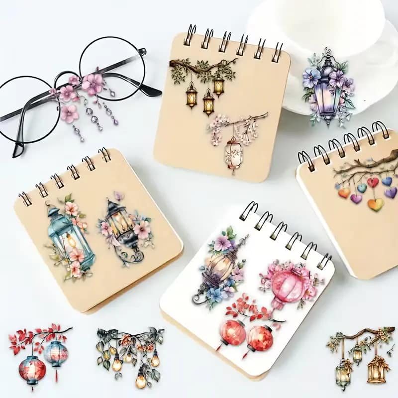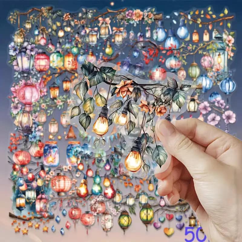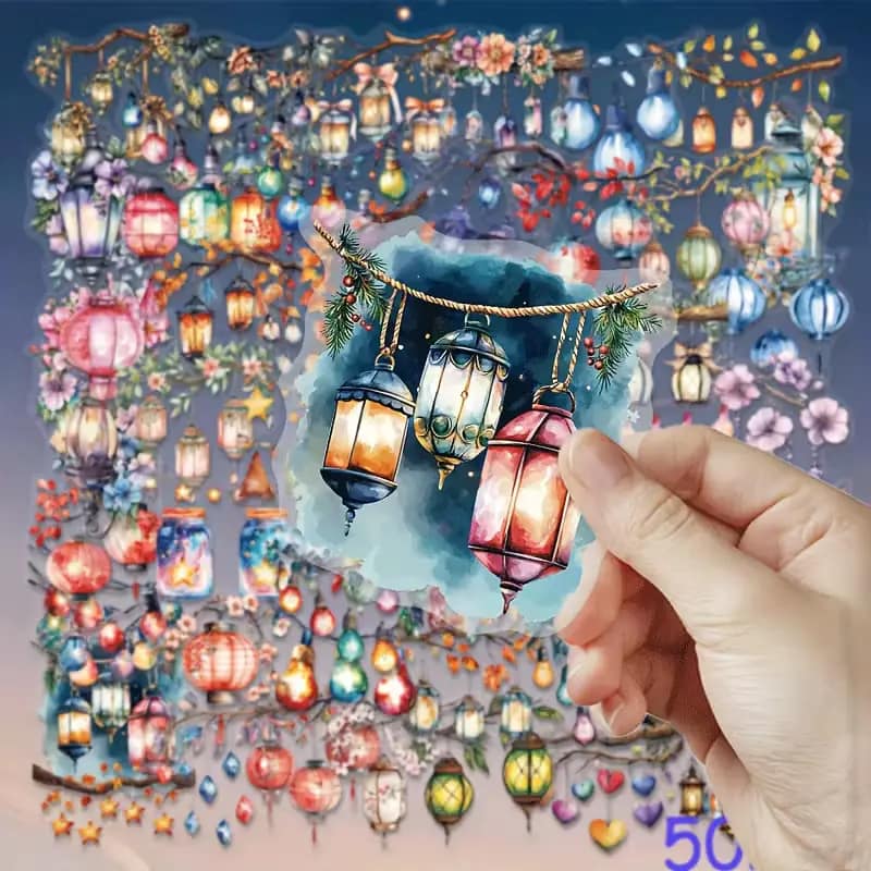 Deze transparante stickers met lantaarnontwerpen zorgen voor een magische en sfeervolle uitstraling in je creatieve projecten. Elke sticker is rijk gedetailleerd, met kleurrijke lampionnen, sierlijke lantaarns en decoratieve accenten die doen denken aan warme zomeravonden of feestelijke nachten.