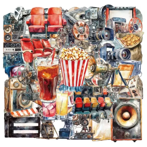 Breng een creatieve knipoog naar de wereld van film en fotografie met deze prachtige transparante stickers. In elk zakje vind je 10 willekeurig gekozen stickers met vintage filmcamera’s, retro bioscoopstoelen, popcorn, filmspoelen, 3D-brillen, regieborden en meer.