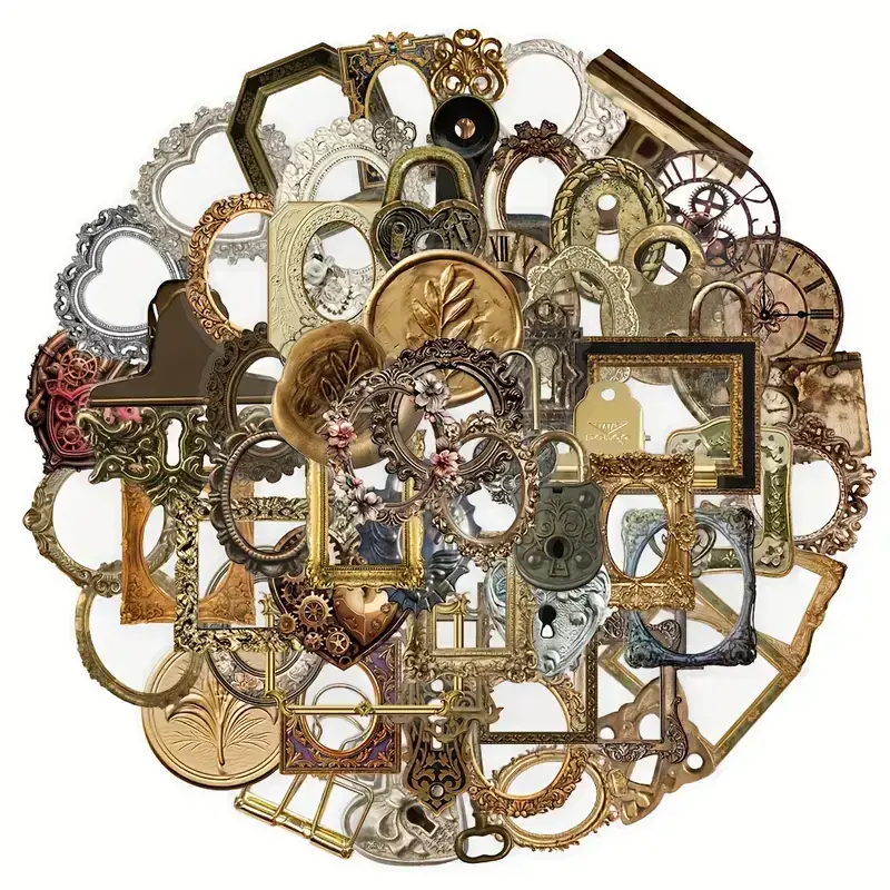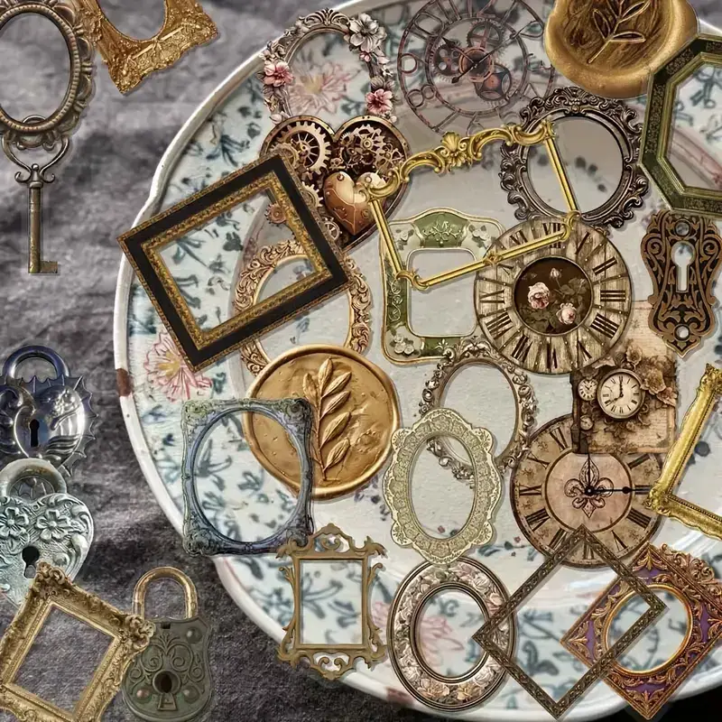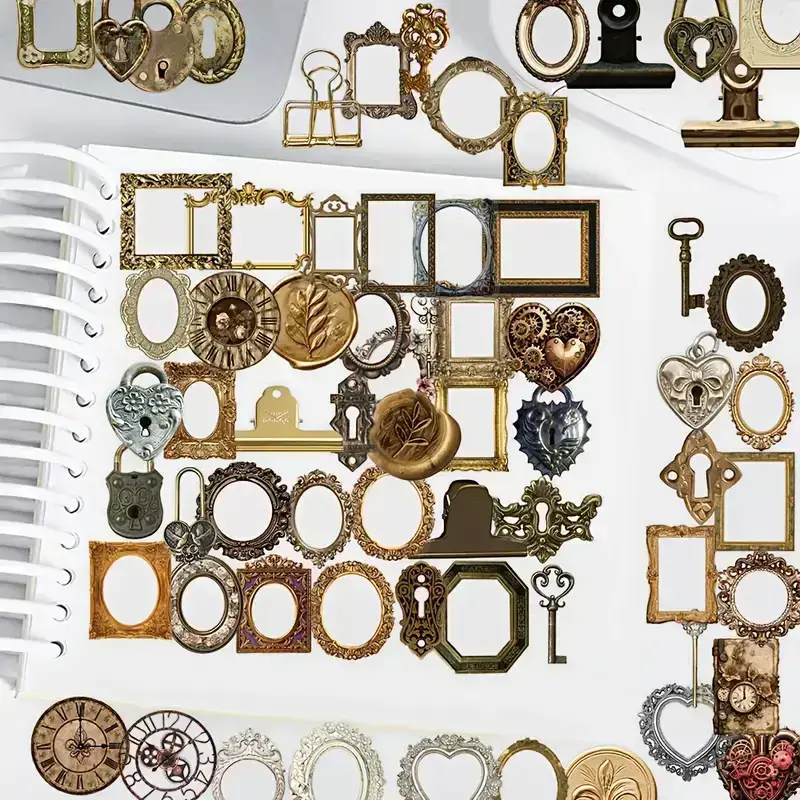 Deze prachtige set transparante stickers in de vorm van kleine retro fotolijstjes en sleutelgaten is perfect om je creaties een elegante en klassieke uitstraling te geven. De designs zijn geรฏnspireerd op antieke lijsten, sierlijke ornamenten, sloten en sleutels โ ideaal voor vintage journaling, nostalgische collages en romantische scrapbookpaginaโs.