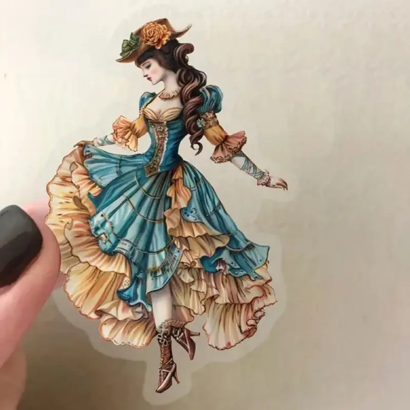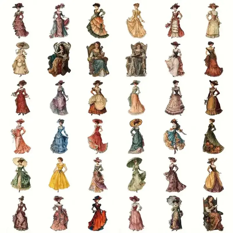 Stap terug in de tijd met deze stijlvolle transparante stickers met afbeeldingen van dames in prachtige vintage kleding. Elke sticker toont een unieke dame in Victoriaanse of Edwardiaanse mode โ compleet met hoeden, rokken en elegante poses.