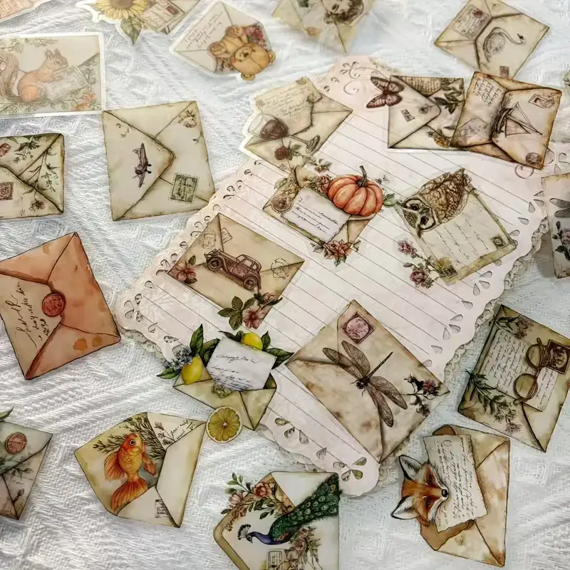 Breng het gevoel van ouderwetse post tot leven met deze unieke transparante stickers met het thema Vintage Enveloppen. Elke sticker toont een prachtig geïllustreerde envelop, rijk versierd met bloemen, postzegels, touw, kaarten en romantische details. Of je nu een dagboek versiert, een brief opleukt of een kaartje maakt: deze stickers voegen direct een warme en nostalgische sfeer toe.