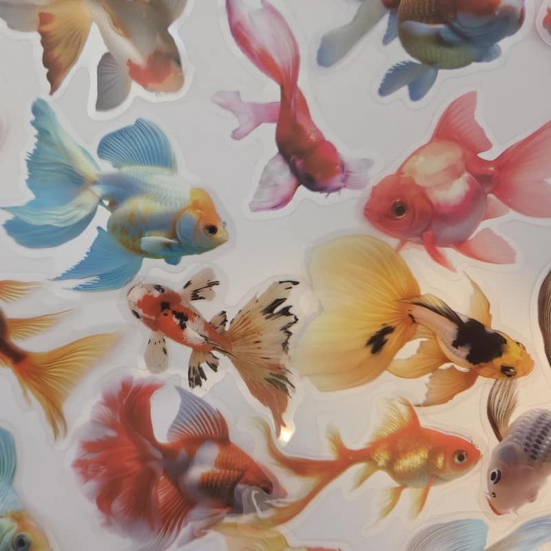 De transparante achtergrond zorgt ervoor dat de stickers naadloos op elk oppervlak passen, waardoor alleen de kleurrijke vissen zichtbaar zijn.